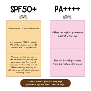SPF50+ and PA++++ provide very high ratings for their respective categories, demonstrating a product's high efficacy at blocking out UVB and UVA radiation